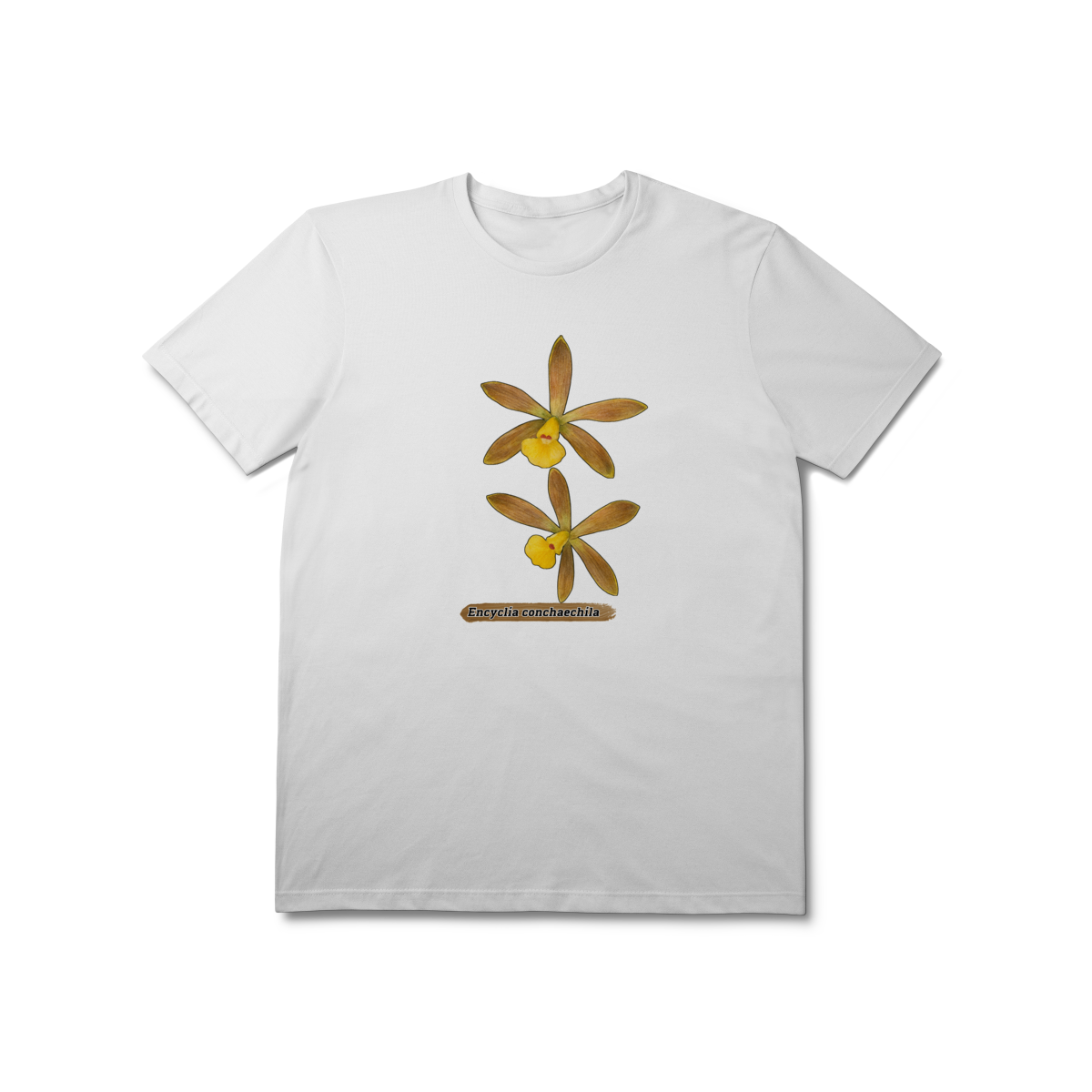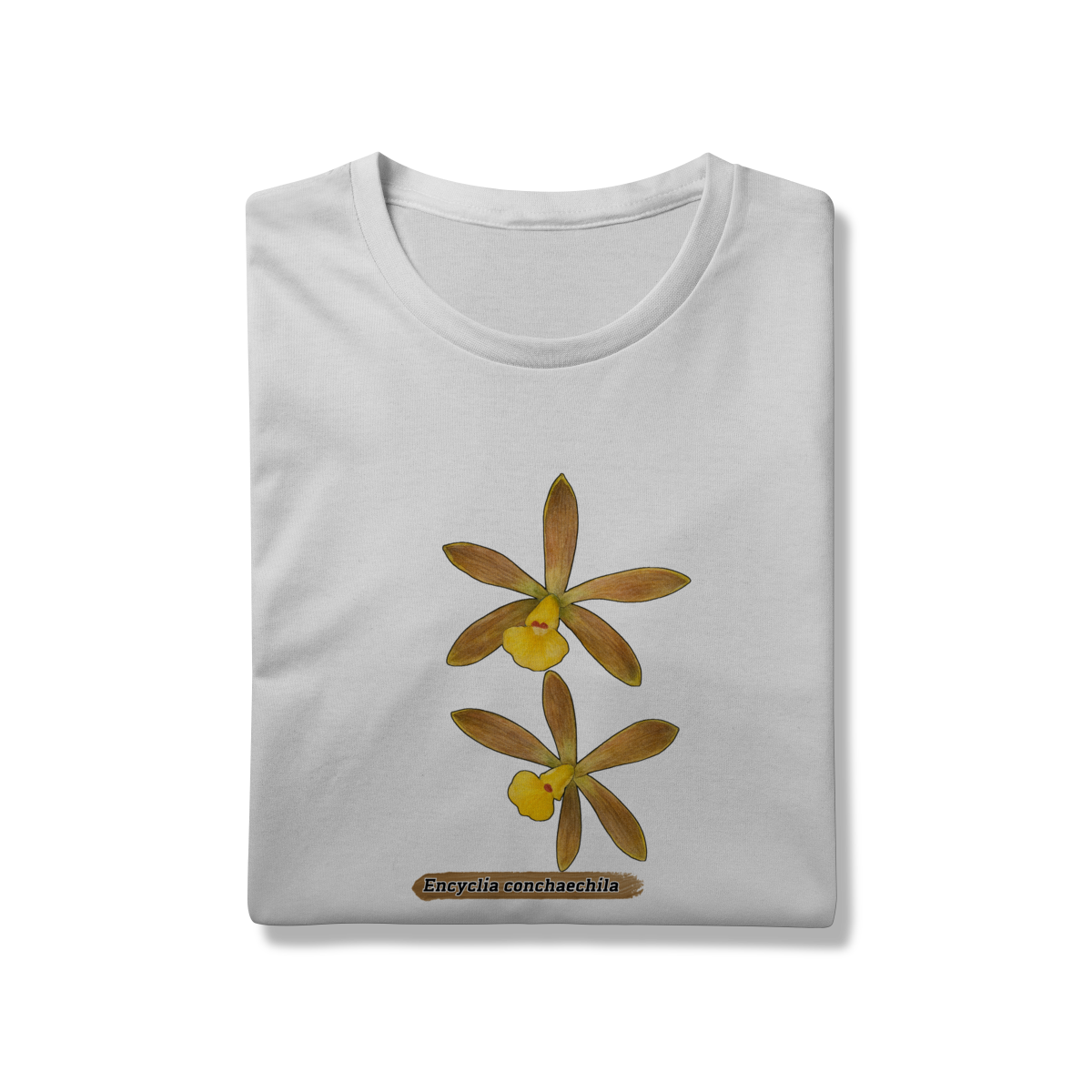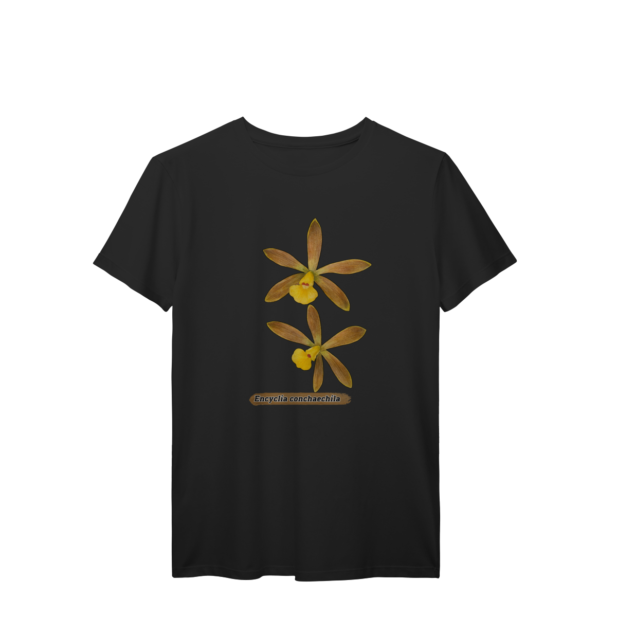 A flora da Amazônia com esta estampa única da orquídea Encyclia conchaechila, uma espécie nativa e encantadora. A arte traz a delicadeza das pétalas em tons suaves, contrastando com folhas tropicais e detalhes botânicos, perfeita para quem ama natureza, biodiversidade e estilo com identidade regional. Ideal para uso casual ou como peça statement em eventos culturais e ambientais.
